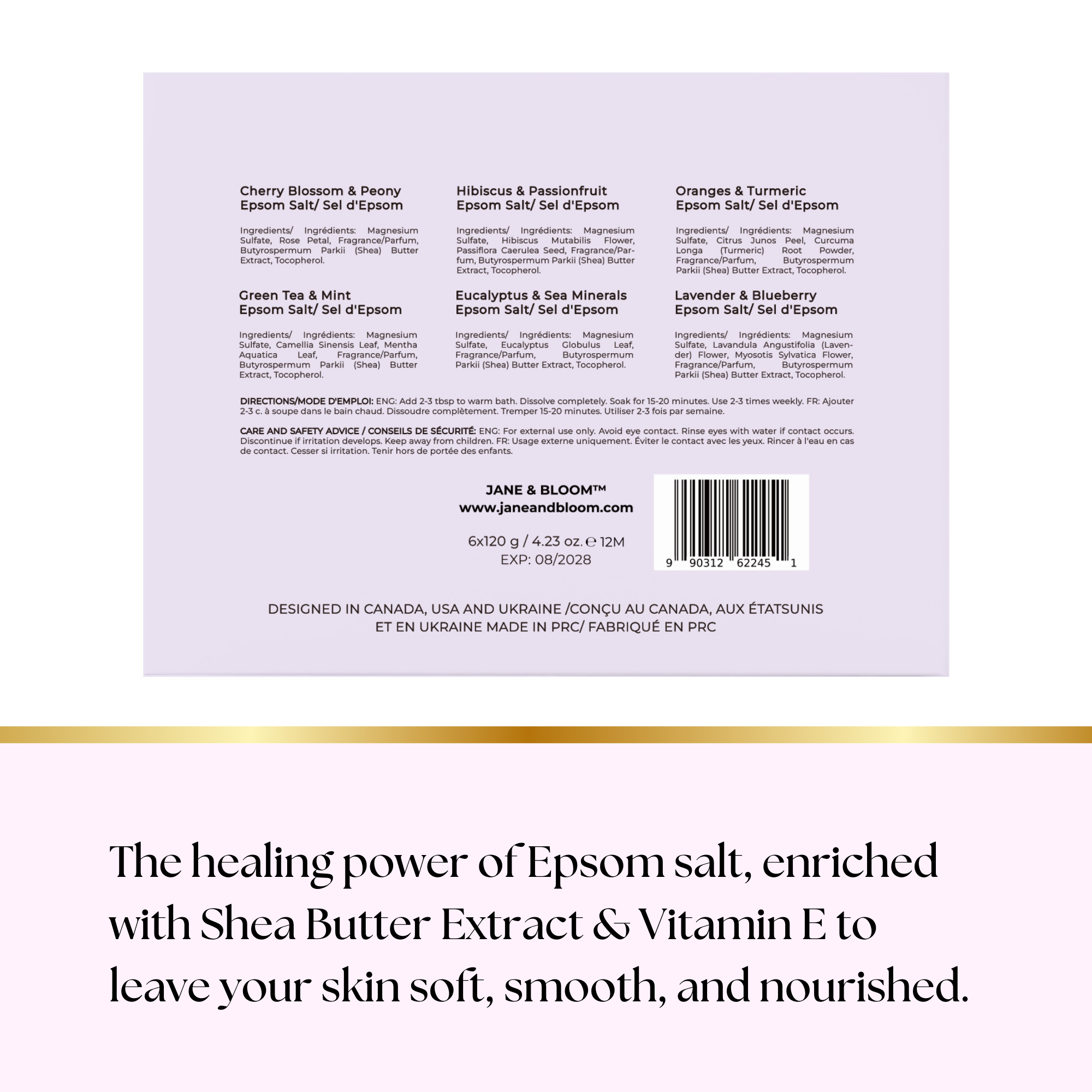 Indulge in a spa-like ritual at home with the Jane & Bloom Epsom Salt Bath Gift Set, a luxurious collection of six aromatherapy blends crafted with pure Epsom salt, premium essential oils, and natural botanicals.