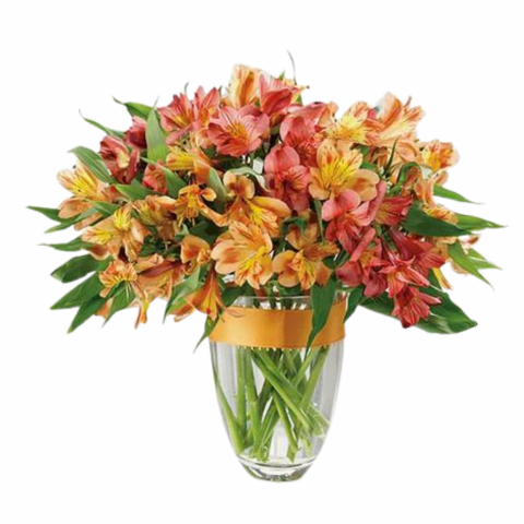 The smell of spices, the taste of pumpkin pie, the golden leaves on the trees and their rustle as you walk through the woods—it's fall, and Golden Autumn encompasses everything wonderful about it in its raffia-decorated vase, warm-colored peruvian lilies, and purple liatris accented with autumn accents.