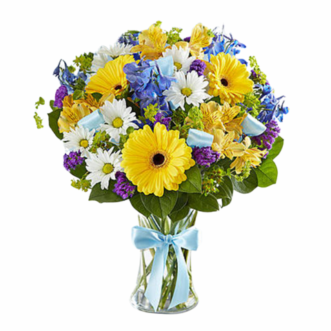 Our Sweet Baby Boy includes white lilies, yellow roses, blue delphinium, statice, and greenery. Sweet Baby Boy Bouquet is a beautiful and thoughtful way to congratulate the proud parents on their little bundle of joy.