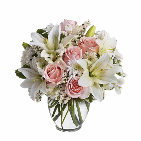 When you want your best wishes to arrive in high style, go with this fashionable, feminine bouquet! Full and fragrant, it gathers roses, lilies and alstromeria in pinks and whites into a clear glass ginger vase.