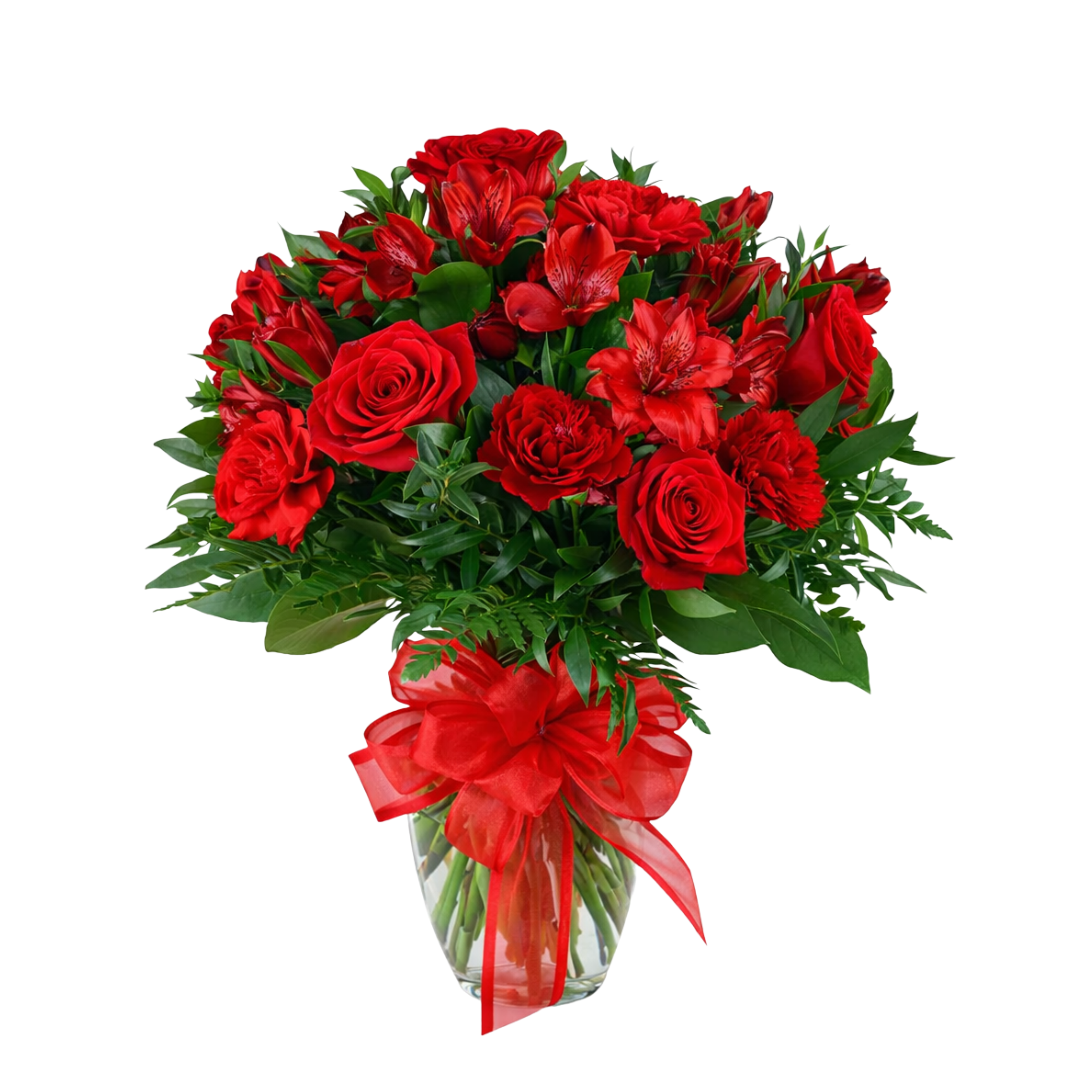 Demonstrate your affection and lasting love with these all red flowers featuring lush red roses, ample red alstroemeria and red carnations with added greenery.