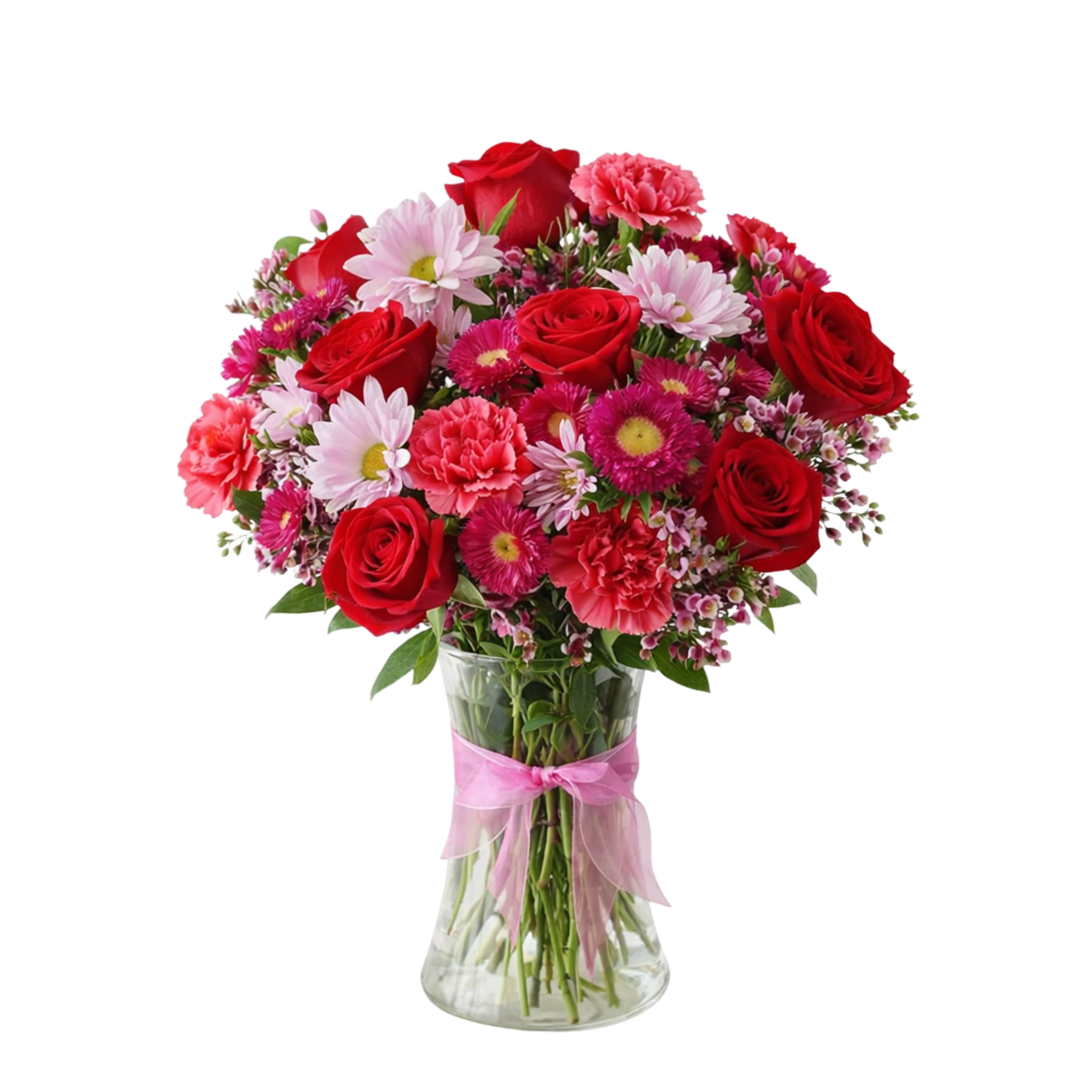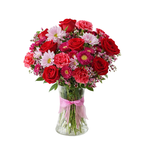 From the heart bouquet is a very nice way to show your best friend or the best girl in your life, that you care about them and appreciate them. Send a big bunch of floral affection in this gorgeous bouquet of roses, carnations, asters, daisy poms and more. Components may vary.