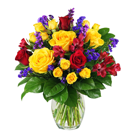 It is a beautifully bright and colorful way to spread sunshine and cheer. Red and yellow roses and red alstroemeria with purple filler create a stunning bouquet accented with assorted greens. Sending this bouquet to your loved ones is a sweet way to light up their life.