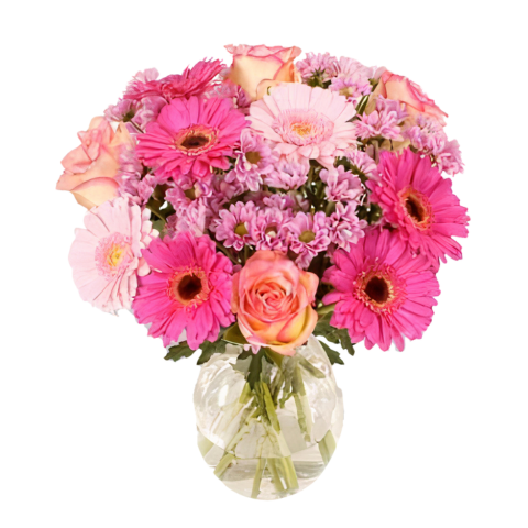 This bouquet is an eclectic mix of subtle, feminine flowers. The bright pink gerberas are perfectly complemented by the soft pink roses and the charming small pink chrysanthemums. A simply adorable bouquet guaranteed to thrill any lover of traditional flowers.