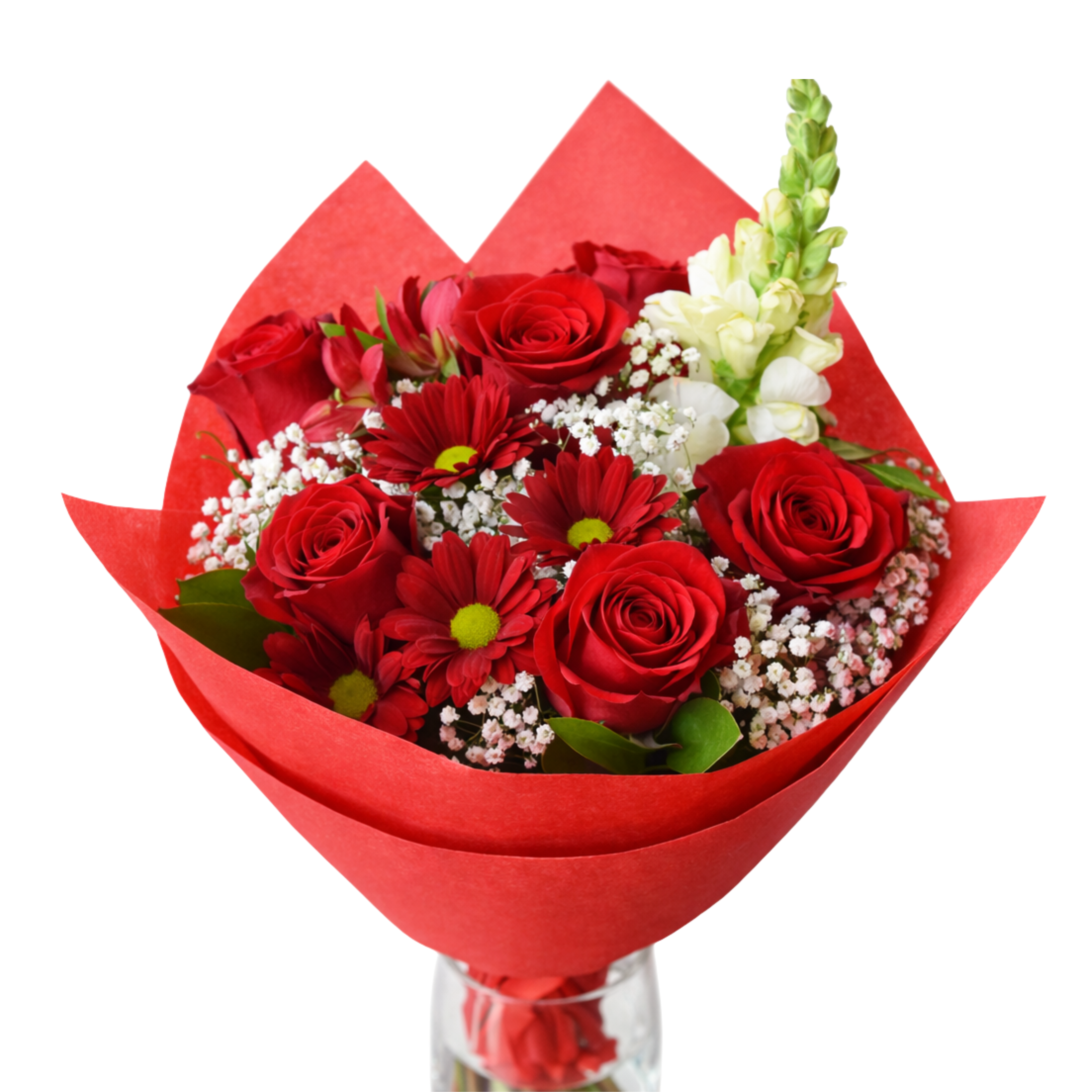 Bold, romantic, and full of charm, this striking red bouquet features fresh red roses paired with cheerful red blooms, delicate baby’s breath, and lush greenery. Hand-tied and wrapped in vibrant red paper, this arrangement makes a powerful statement of love, admiration, and celebration.