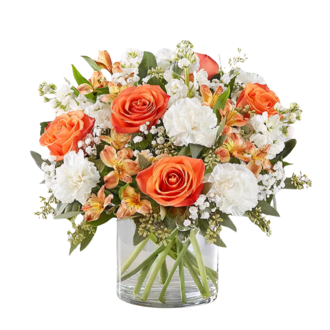 Orange roses, white carnations, peachy alstroemerias, and fancy greenery are delivered in a lovely glass vase. Be sweet and send this one today!