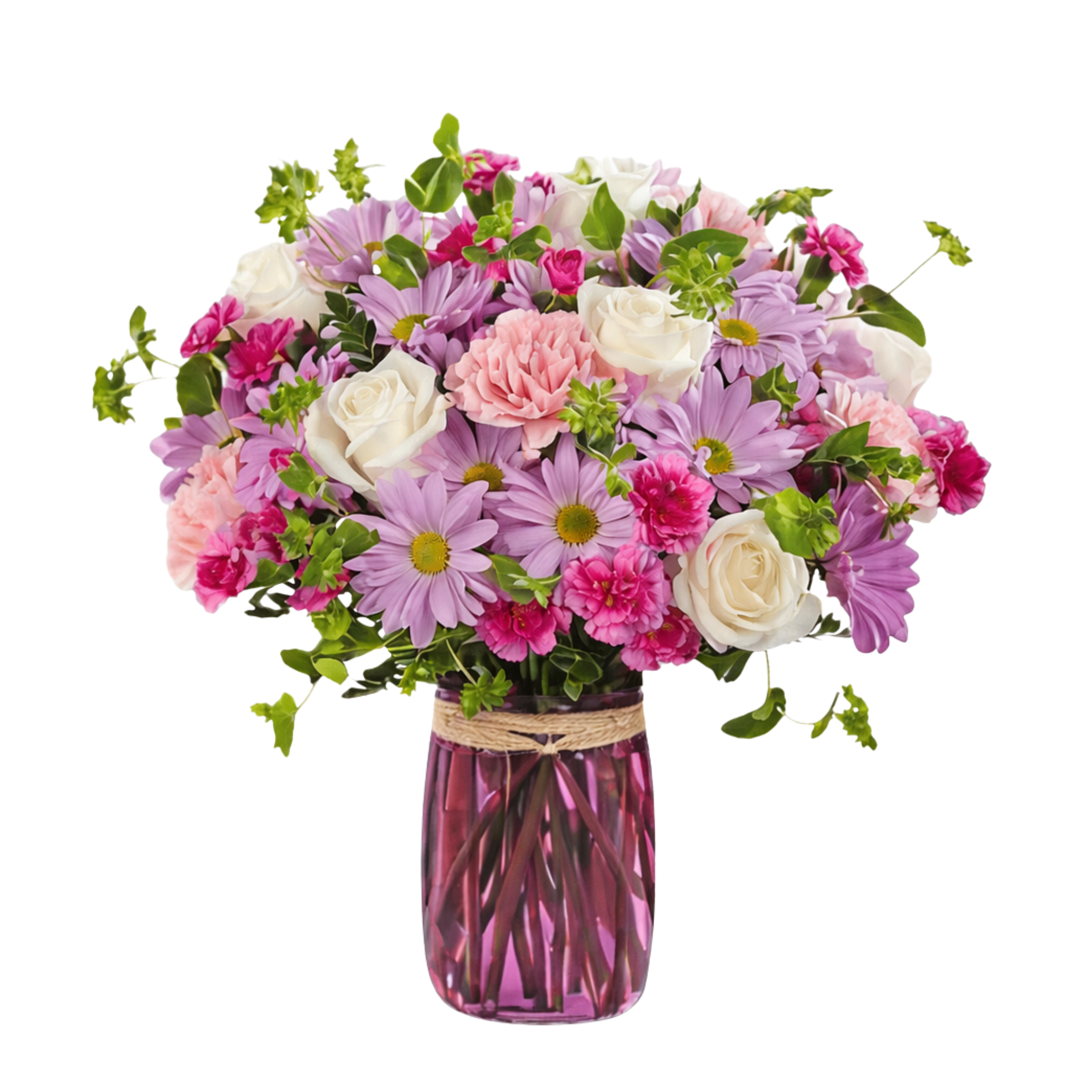 Enchant someone today! White roses and spray roses, lavender daisies and spray carnations, all perfectly arranged in a pink glass vase.