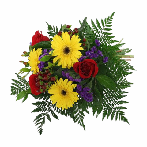 Freshly cut and wrapped bouquet of yellow Gerbera daisies, red roses and purple statice, with berries and fern. This wrapped bouquet will tantalize and delight the recipient with it's bold colors and fresh, lively vibe.