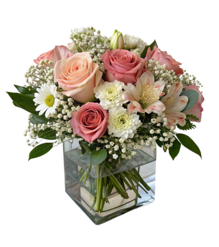 Classic roses, spray roses, alstroemeria, and daisies, paired with baby’s breath and soft greens, in a clean and modern cube vase - timeless gift of beauty and elegance.