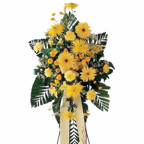 Eloquently express your sympathy with this stunning floral arrangement of yellow alstroemeria, carnations, chrysanthemums and gerberas.