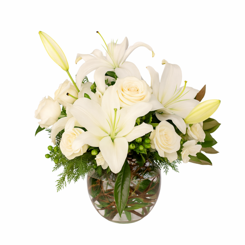 The splendor of the season is beautifully captured in this traditional holiday arrangement. The mix of blossoms and holiday greens is a brilliant way to say Merry Christmas!