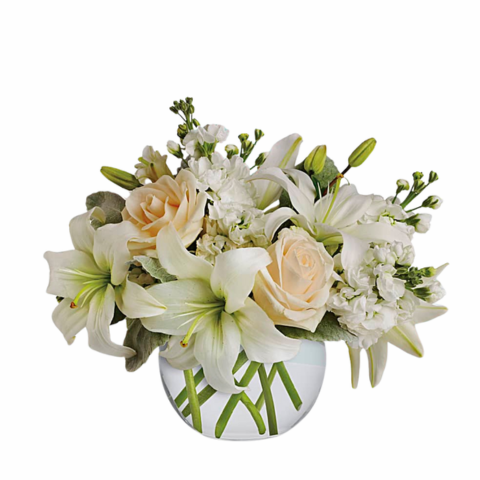 Breathtaking! Blooms of bright white and cream are rich with texture and innocent beauty. Presented in a versatile bubble vase she'll use later for roses, tulips, potpourri, and candlelit centerpieces, this is a fabulously fragrant choice for a bride-to-be, your beloved mom, or an old friend.