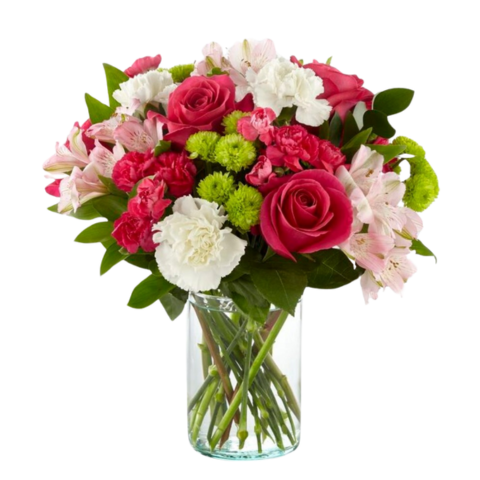 This charming spring bouquet will send a breath of fresh colorful air with its clear bright colors and the lovely selection of different flowers, each with its own particular style. Our alstroemeria may arrive unopened but the buds will come into bloom within a day or two and the recipient will be able to enjoy the flowers for even longer.