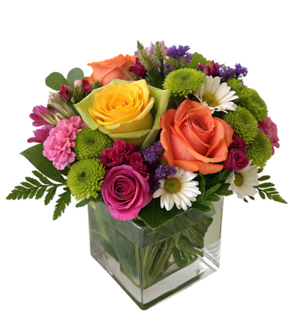 A joyful combination of roses, mini carnations, daisies, alstroemeria, and statice, framed by lush greenery and presented in a modern cube vase.