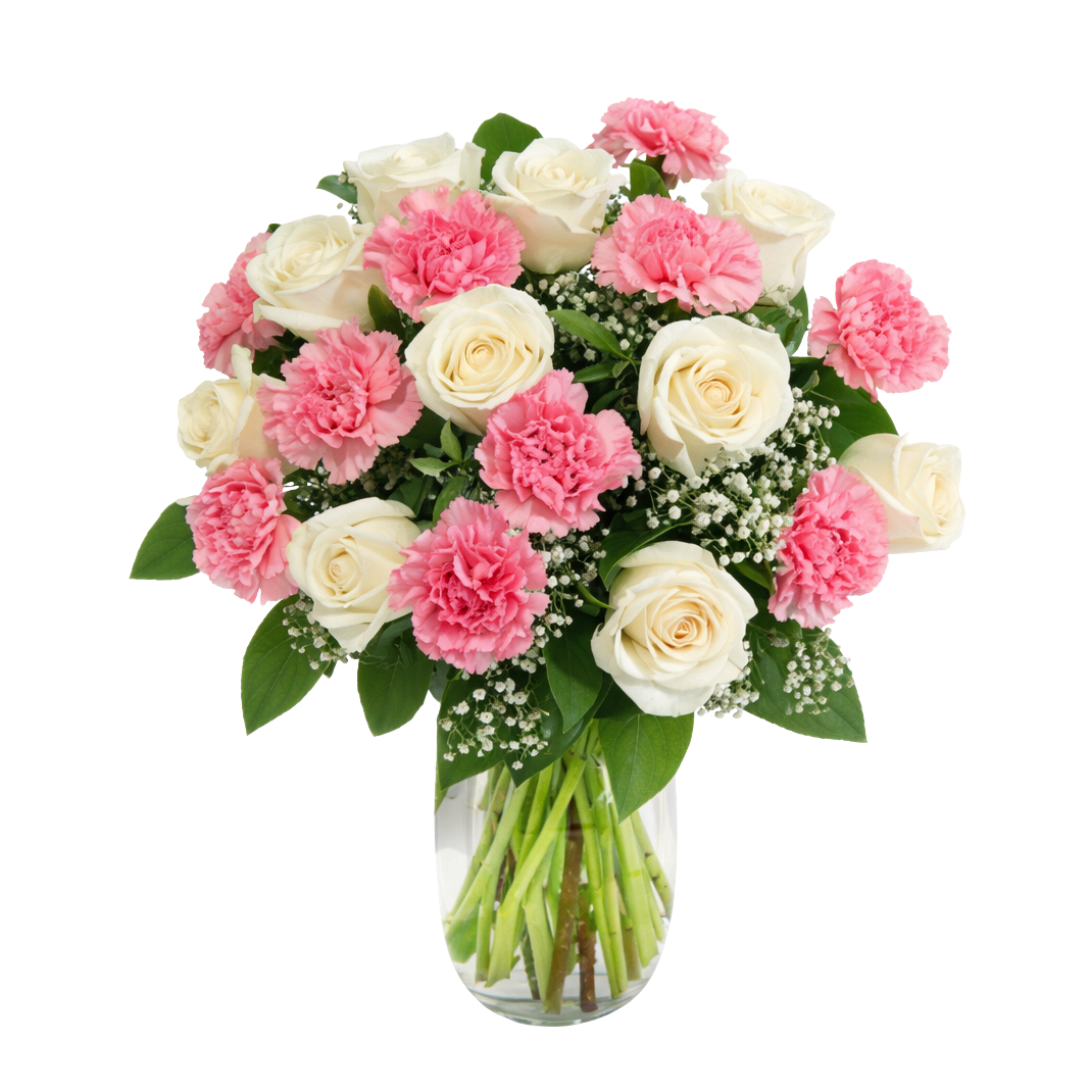 Soft, romantic, and beautifully balanced, this elegant bouquet features creamy white roses paired with delicate pink carnations and airy baby’s breath. Accented with fresh greenery and arranged in a clear glass vase, the bouquet offers a timeless look filled with grace and gentle charm.