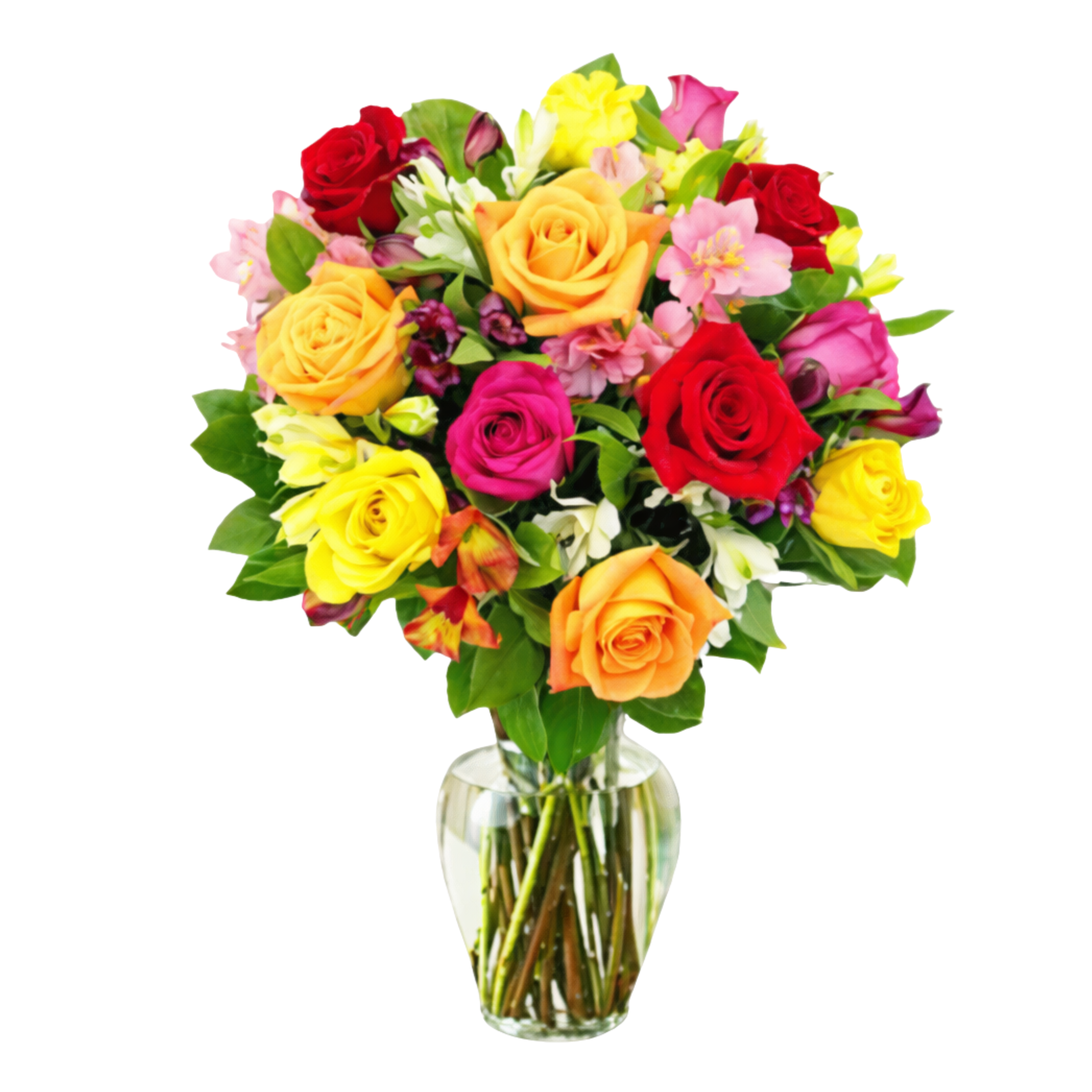 Bright, joyful, and bursting with color, this cheerful bouquet features a lively mix of red, yellow, pink, and peach roses accented with fresh seasonal blooms and lush greenery. Arranged in a clear glass vase, the bouquet creates a vibrant and uplifting display that instantly brings warmth to any space.