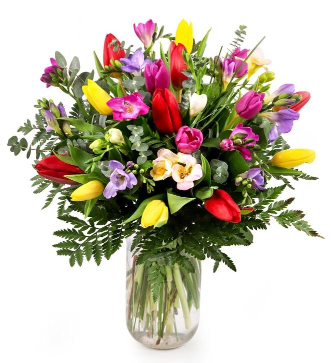 You will find all the shades of spring in this perfectly designed flower arrangement. Bright and cheerful - a brave choice to make someone's day special!