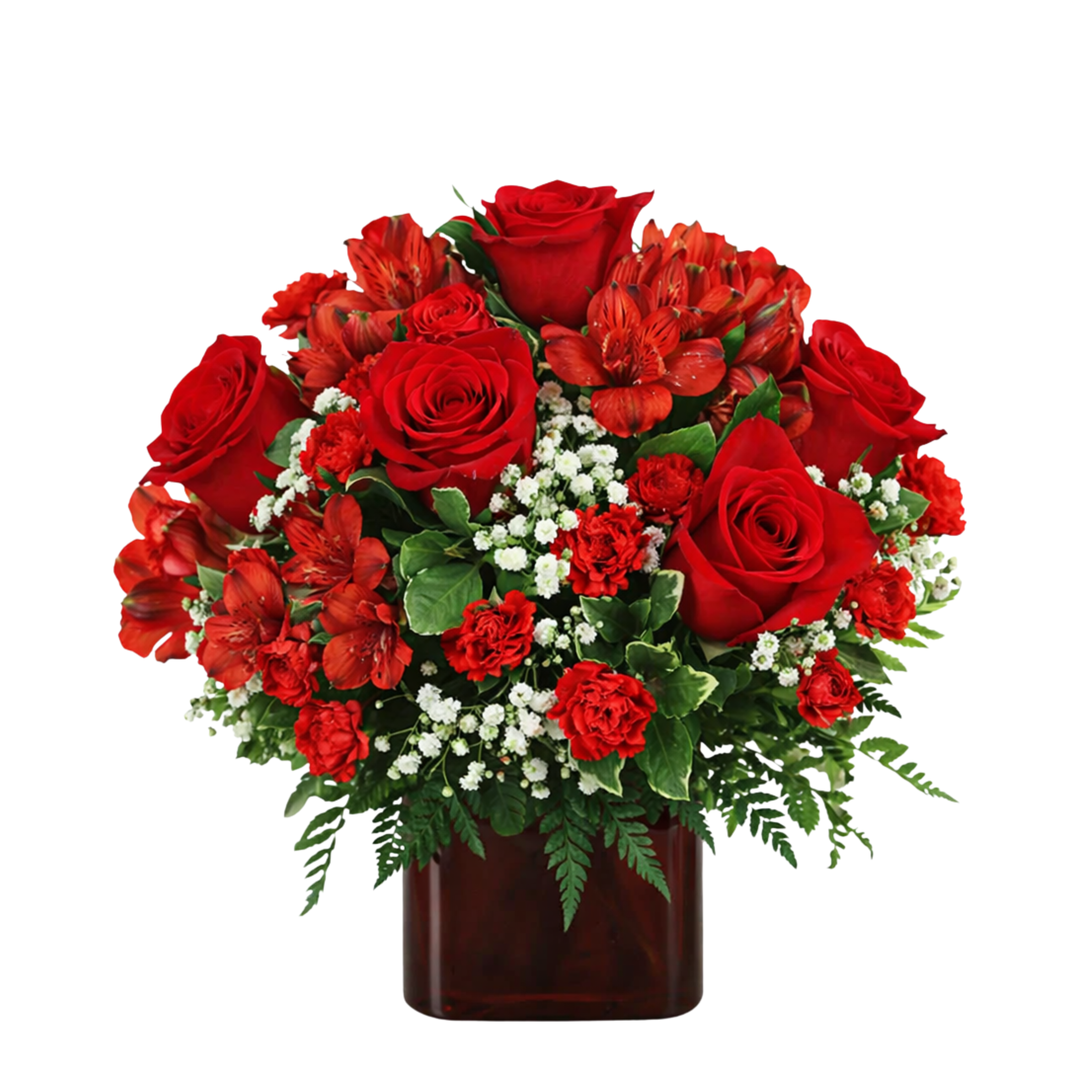 Bold, rich, and undeniably elegant, this striking arrangement features luxurious red roses paired with vibrant alstroemeria, textured carnations, and delicate baby’s breath, all nestled among lush greenery. Designed in a sleek, modern container, the bouquet creates a dramatic and sophisticated statement.