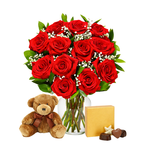 This is it, everything you need to "WOW" her this Valentine's Day in one special offer. This special package includes 12 premium long stem red roses, the upgraded ruby vase, chocolate truffles, and our Valentine's Day Bear. The classic: 12 red roses, long stems, with baby's breath. There is no flower that expresses true love as timelessly and as perfectly as the long-stemmed red rose.