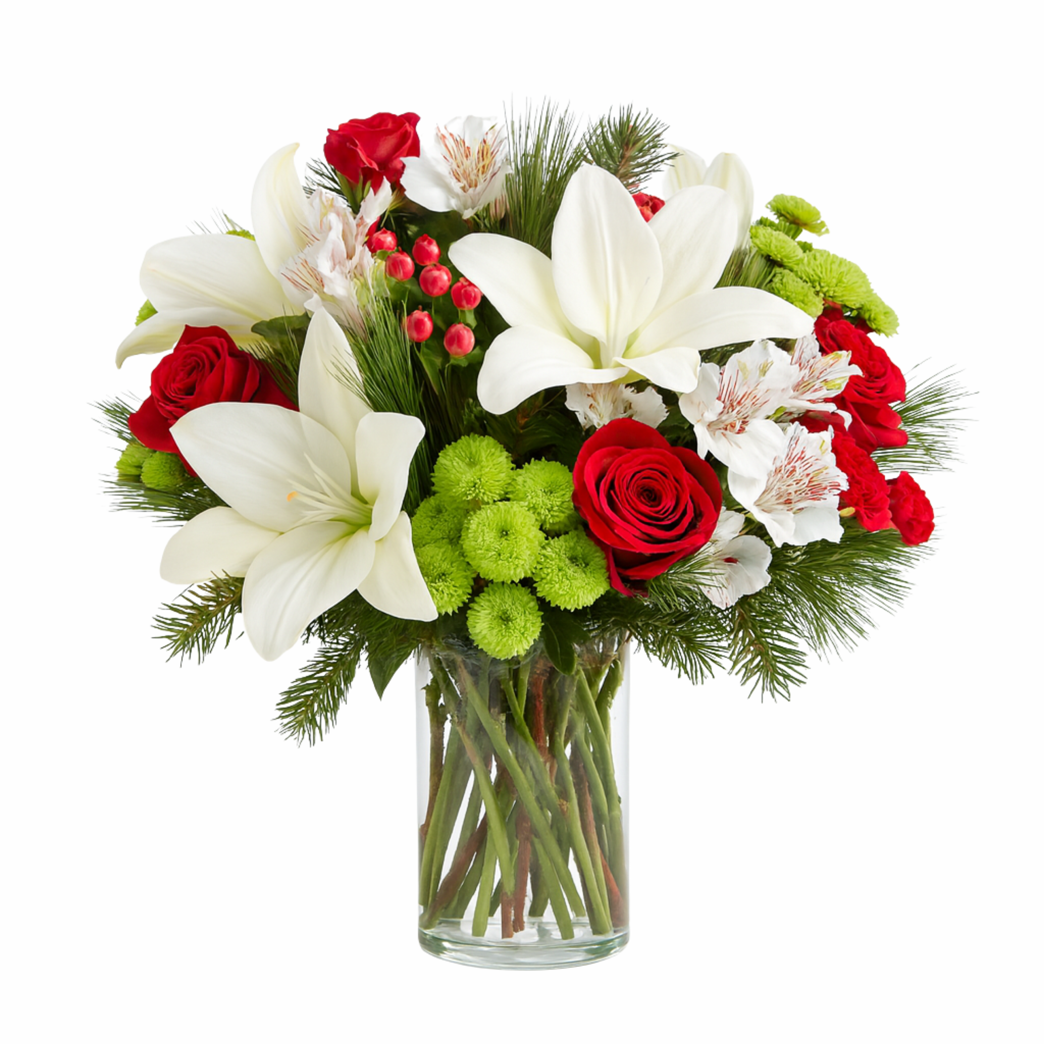 Red roses and white lilies are a wonderful surprise any time of year. Make an impression with our spectacular arrangement of lilies, roses, alstroemeria, daisies assorted with greens, designed in a stylish glass vase.