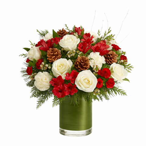 The splendor of the season is beautifully captured in this traditional holiday arrangement. The mix of blossoms, holiday greens, and textures is a brilliant way to say Merry Christmas!
