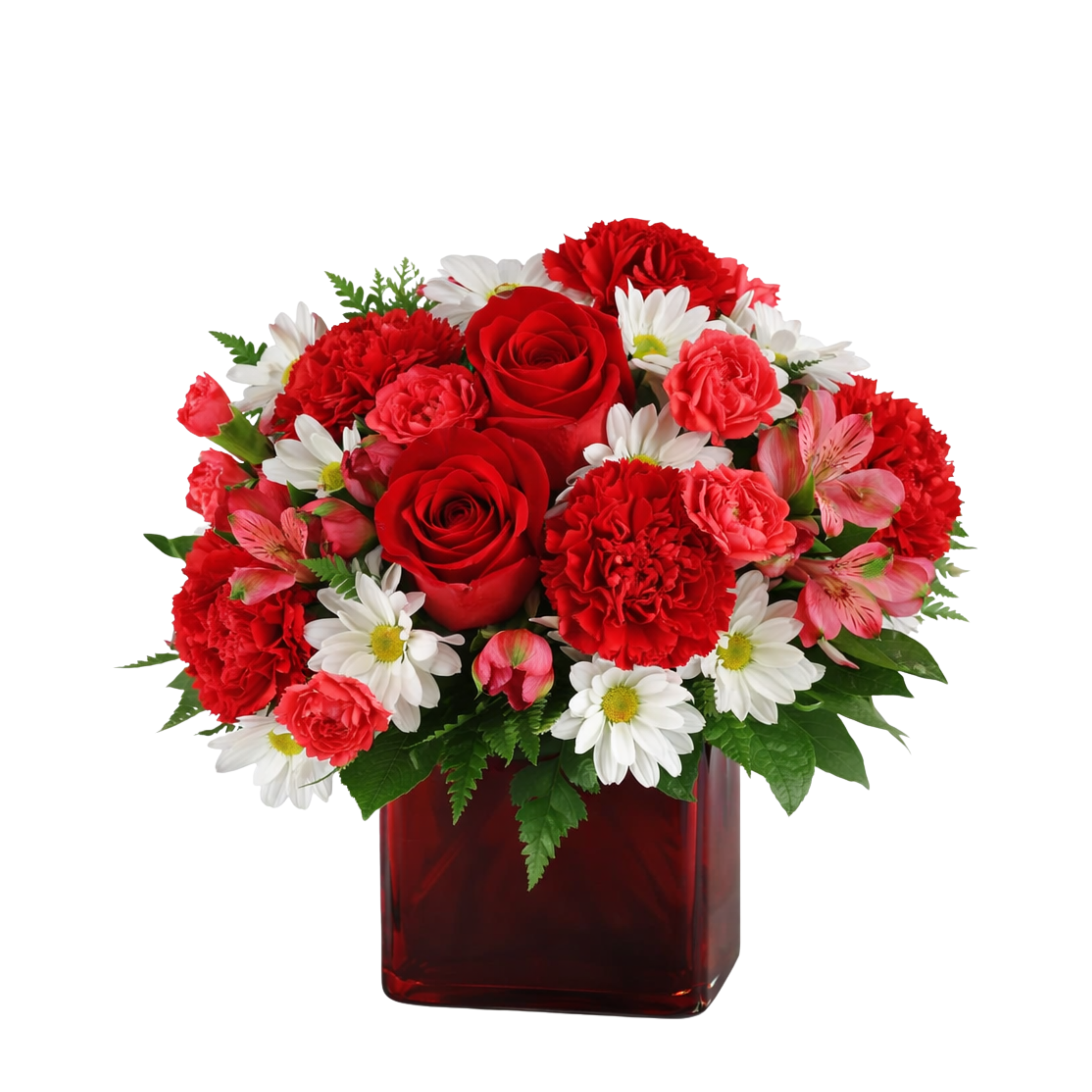 Bright and full of life, this beautifully balanced arrangement features rich red roses and carnations paired with cheerful white daisies and soft pink accent blooms. Fresh greenery adds texture and contrast, all thoughtfully designed in a classic red cube vase for a bold yet elegant presentation.