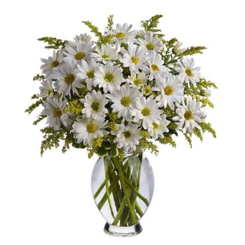 Daisy days are here again! Send someone this cheerful bouquet of happy-faced white blooms, complete with sunny yellow centers – and presented in a graceful, curved inspiration vase – and they’re sure to have a wonderful day.