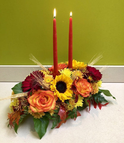 Orange roses, bright sunflowers, dark red gerberas, gold chrysanthemums are accented with autumn greenery and red candles.