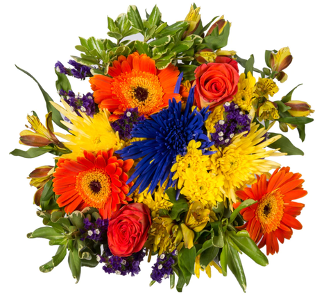 If pastels aren't quite doing it for you in fall, then this flower-mixed bouquet will give you that pop of color you're looking for! It's hard for this arrangement to be anything but uplifting with a combination of Gerberas, Roses, Anastasia Spider Mums, Purple Statice, and Alstroemeria. The vase is not included