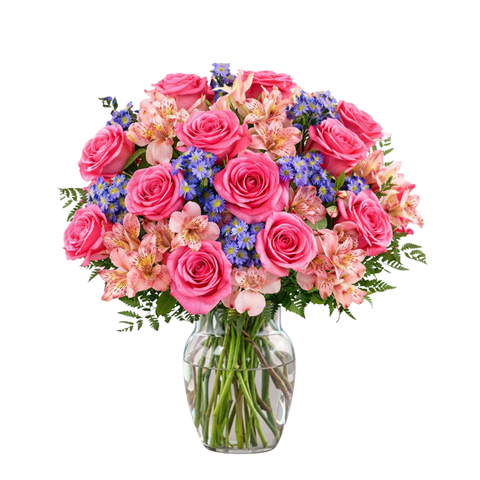 She is the perfect woman: Kind, gentle, grateful, and sweet. And you want to give her the perfect flowers: Feminine, beautiful, something to show her how much you care. The average roses get a modern twist with fresh alstromeria—a perfect bouquet for any occasion.