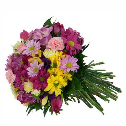 Beautiful Spring-inspired hand-tied bouquet of lavender, mauve, pink and yellow blooms.