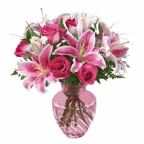 Tell her how much you care. Send her this elegant bouquet of hot pink roses and Stargazer lilies. This fragrant bouquet is beautifully presented in a lovely pink cut glass vase with clear diagonal striping. A beautiful gift for a beautiful lady. * Free Standard delivery if you order online * The vase is included in the price * Standard arrangement size - Approximately 10" W x 14" H