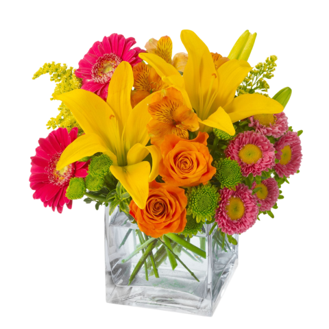 Make a summertime splash with a pop art mix of yellow lilies, set against a jumble of hot pink, orange and green flowers and presented in a modern glass cube vase! This vivid bouquet will bring warm-weather fun to someone’s day.