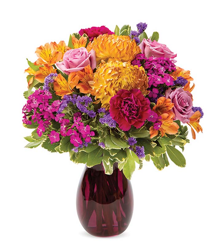 Fun, chic, and breathtaking, this incredible rainbow of fall flowers is perfect for a fun, vibrant, friend or loved one. This enchanting array of gorgeous colors and fragrant blooms will bring a mini rainbow into any room in your home. Simply watch and be mesmerized as the sunlight reflects the stunning variety of pink, magenta, purple, lavender, bronze, orange, and gold tones.