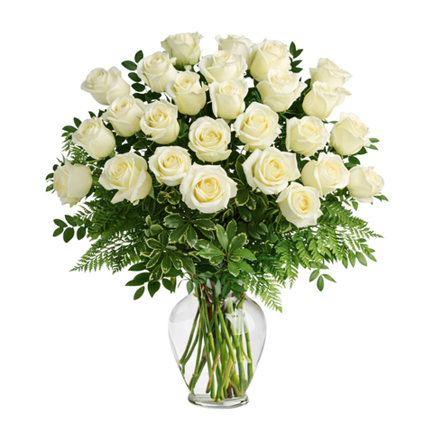 Two dozen fresh-cut white roses arrive perfectly arranged with Italian greenery in a clear glass vase.