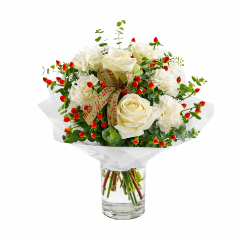 For a wintertime bouquet that's as pure as the driven snow, send this unexpected gift of white roses and carnations, accented with berries, and greenery. A simple pleasure for Christmas!
