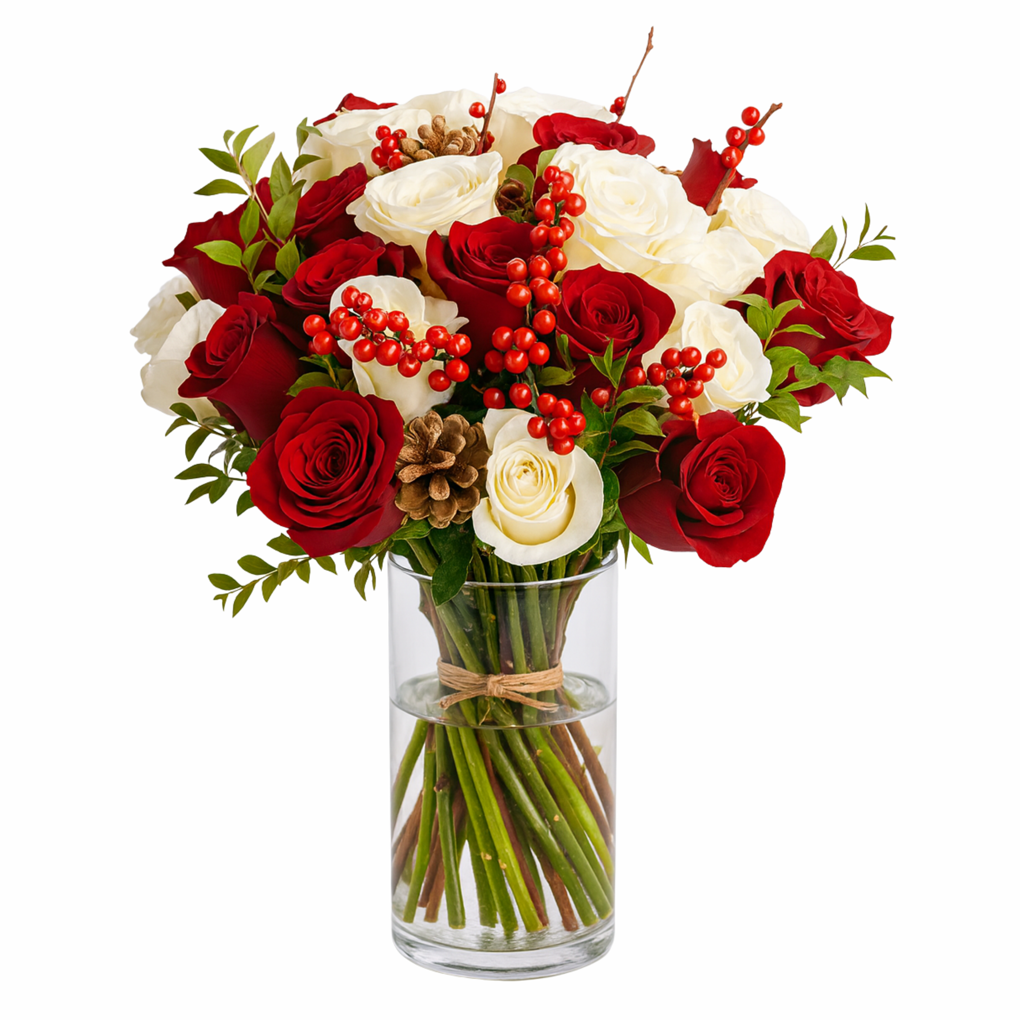 Two dozen red and white roses make a dashing holiday gift, especially when they are arranged with berries and pine cones and delivered in a clear glass vase.