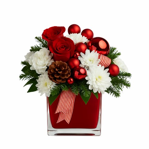 The splendor of the season is beautifully captured in this traditional holiday arrangement. The mix of blossoms, holiday greens, and textures is a brilliant way to say Merry Christmas!